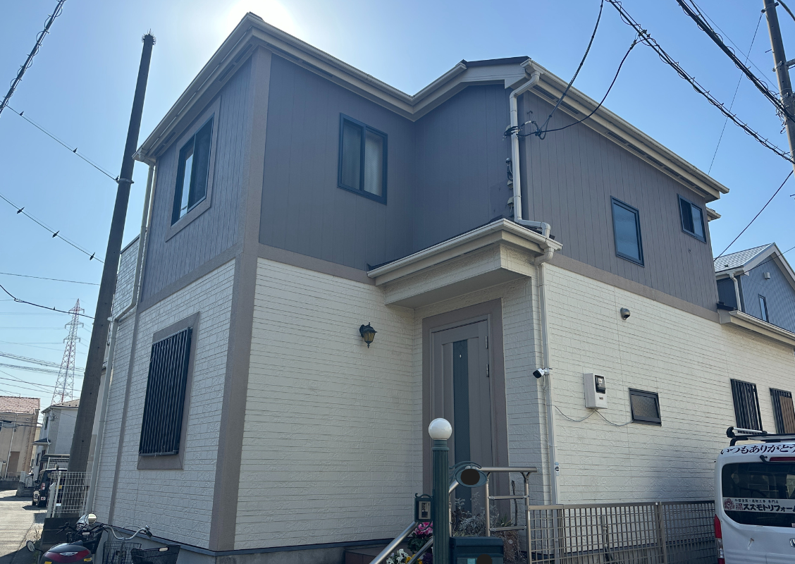 サイディング外壁をブルーグレイとホワイトのツートンで塗装しました!