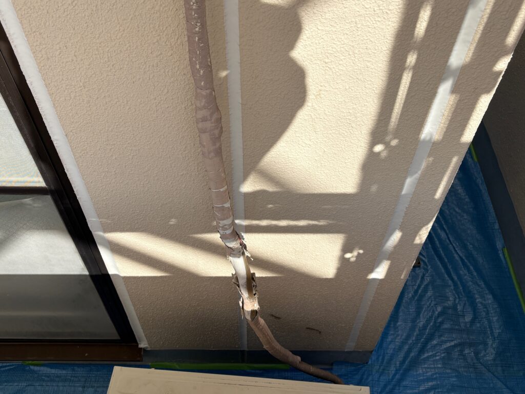 ALC板間目地シーリングの完了とエアコン室外機のホースの痛みが確認できます。