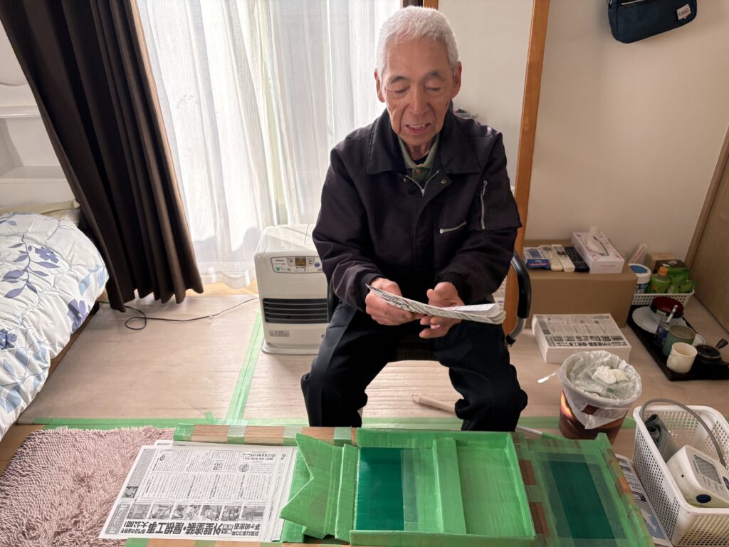 この手作りの織機を使い一枚一枚丁寧に、正吉さんは一日およそ500枚、月に約12,000枚ものチラシを、今も変わらず一軒一軒配布してくれています。