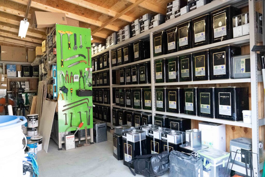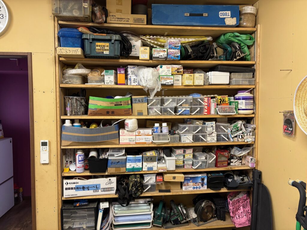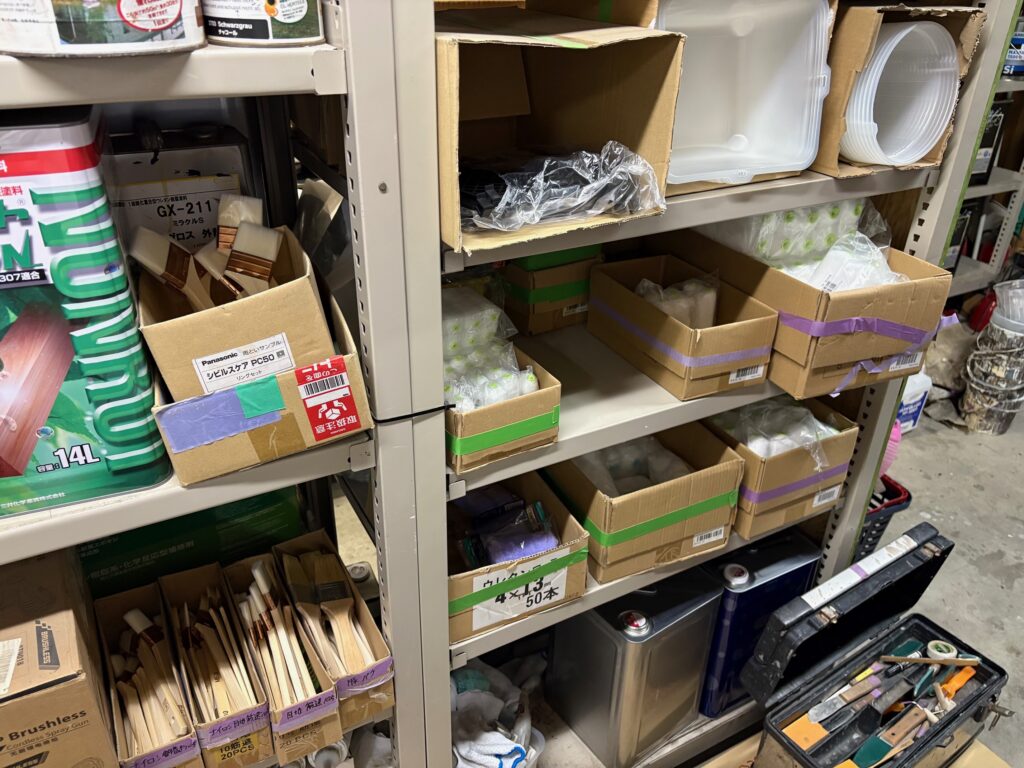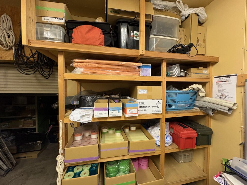 倉庫の中には、現場で使ういろいろな工具や材料がたくさんあります。