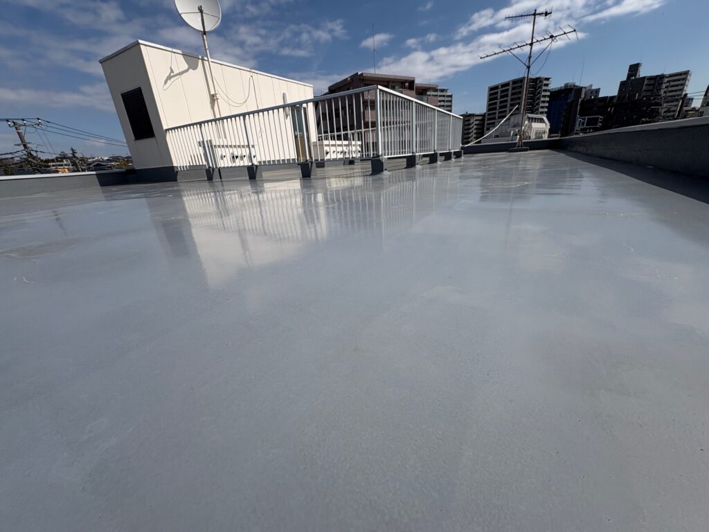 工事後5年目のでマンションの防水の点検に、膨れ、切れ、剥がれ、トップコートの状態などをを細かく点検していきます。とても良い状態でしたが、5年目なので近い将来トップコートを塗り直して防水層を保護します。