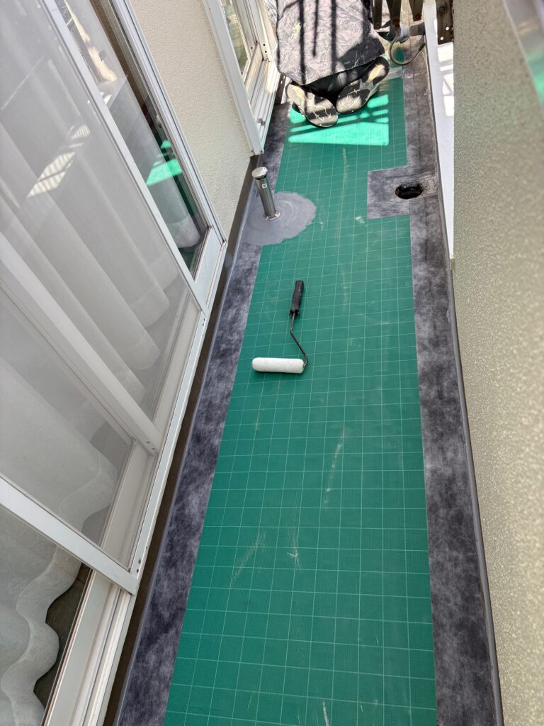 屋根工事と並行してバルコニー防水は割れが多く有ったので通気緩衝工法で行います。ゴム厚が付くように丁寧に行われていました。下の写真は玄関前の基礎部分の左官補修中の写真です。