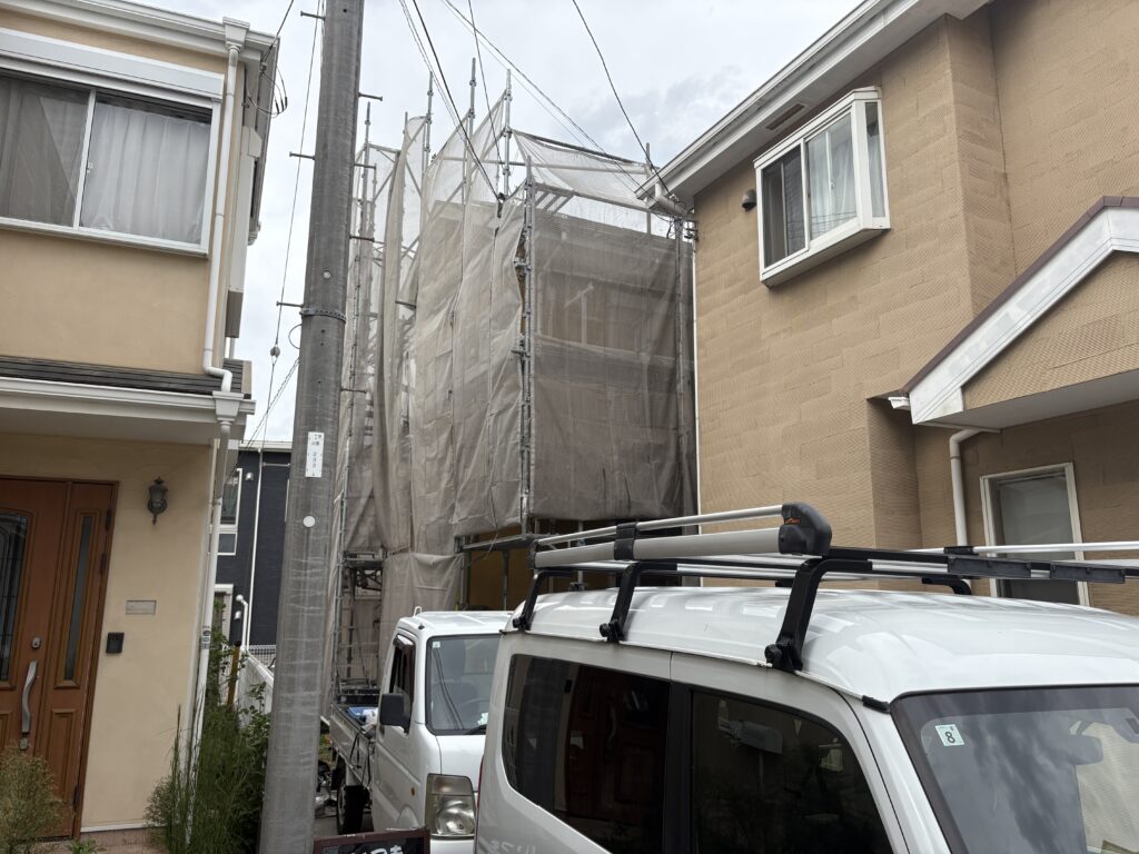 先日足場を組立て、本日高圧洗浄作業を行なっています。外壁・屋根を塗装する前の大切な下地処理ですので、丁寧に洗浄を行います。