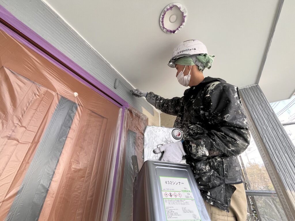 本日は外壁の下塗り作業を行いました。下塗りは仕上げ塗料の密着を良くし、塗装を長持ちさせるための大切な工程です。外壁の状態を見ながら、吸い込みや塗りムラが出ないよう丁寧に塗り込んでいきました。