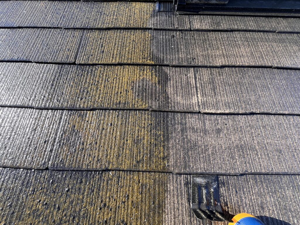洗浄前と後の違いです。乾燥すると新築時の塗装が藻や苔と一緒に洗い流されて地肌が出ています。浸透性造膜プライマー(エタニティーEX2)を塗り、しっかりとした下地ができあがれいます。