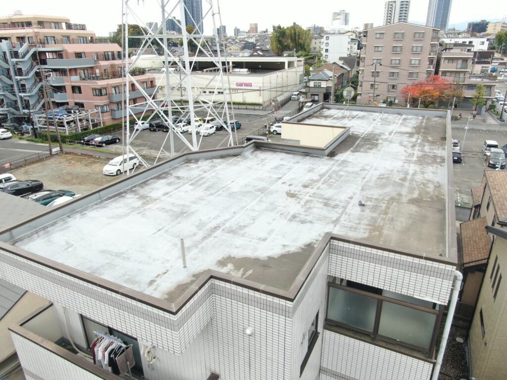 今回の建物は鉄骨ALC構造で、以前は「ゴムシート防水」が施工されていました。相性の良い防水ですが、耐久年数を超えたことで劣化が進んでおり、現状は限界に近い状態です。
