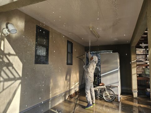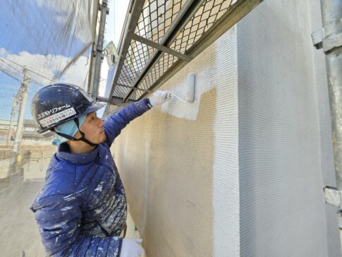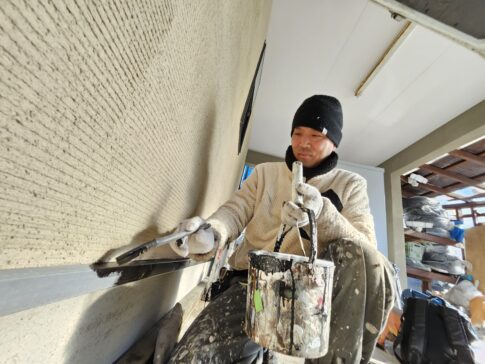 現場親方ブログこんにちは!スズモトリフォームの杉浦です!2/8本日の作業風景です。 軒天中塗り 軒天上塗り 外壁下塗り 本日外壁下塗り終了しました!明日から外壁中塗り・上塗り進めていきます!!