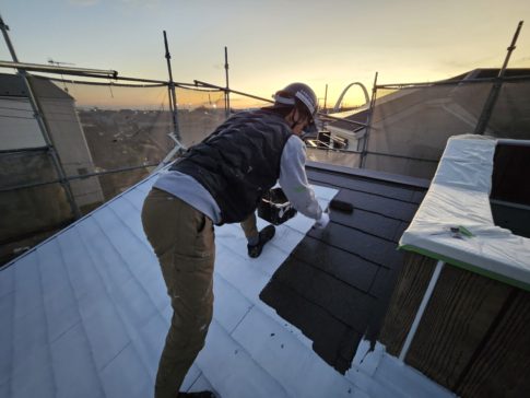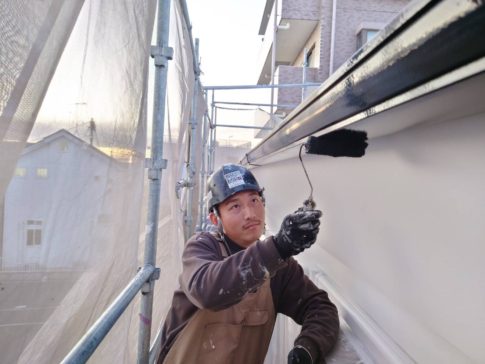 現場親方ブログこんにちは!スズモトリフォームの杉浦です!11/25本日の作業風景 屋根上塗り 横樋破風塗装 今日で上回りの塗装が終了しました!明日から養生ばらし、縦樋上塗り等の塗り物を仕上げていきます!!