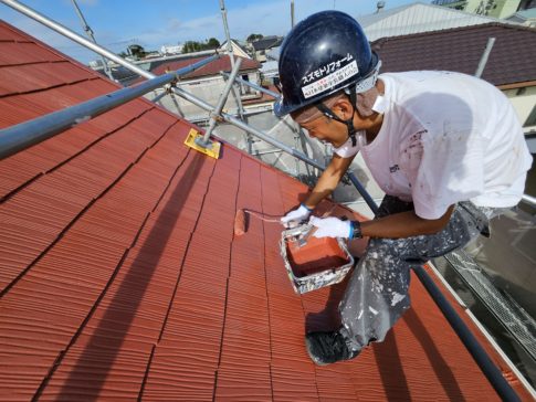 現場親方ブログですこんにちは!スズモトリフォームの杉浦です!10/27本日の作業風景 屋根中塗り 屋根の中塗りが終了し明日からは養生の方進めていきます!!