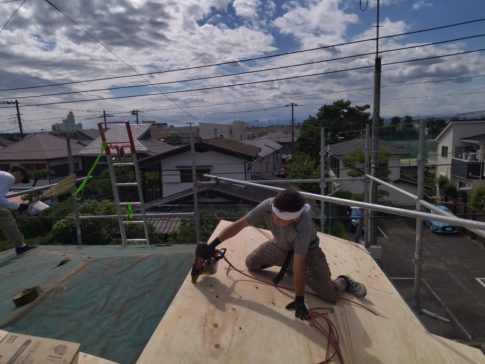 現場親方ブログコロニアル撤去、下地ベニヤ張り、防水紙作業です。 本日は大屋根作業でした。明日は下屋根の作業をしていきます!