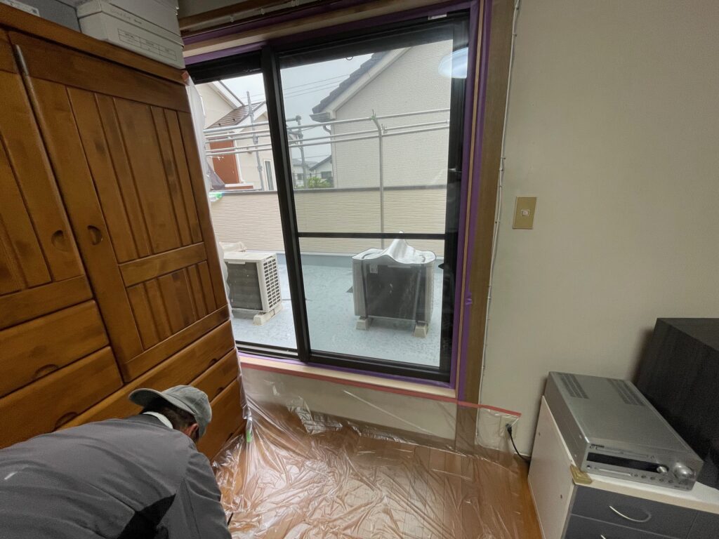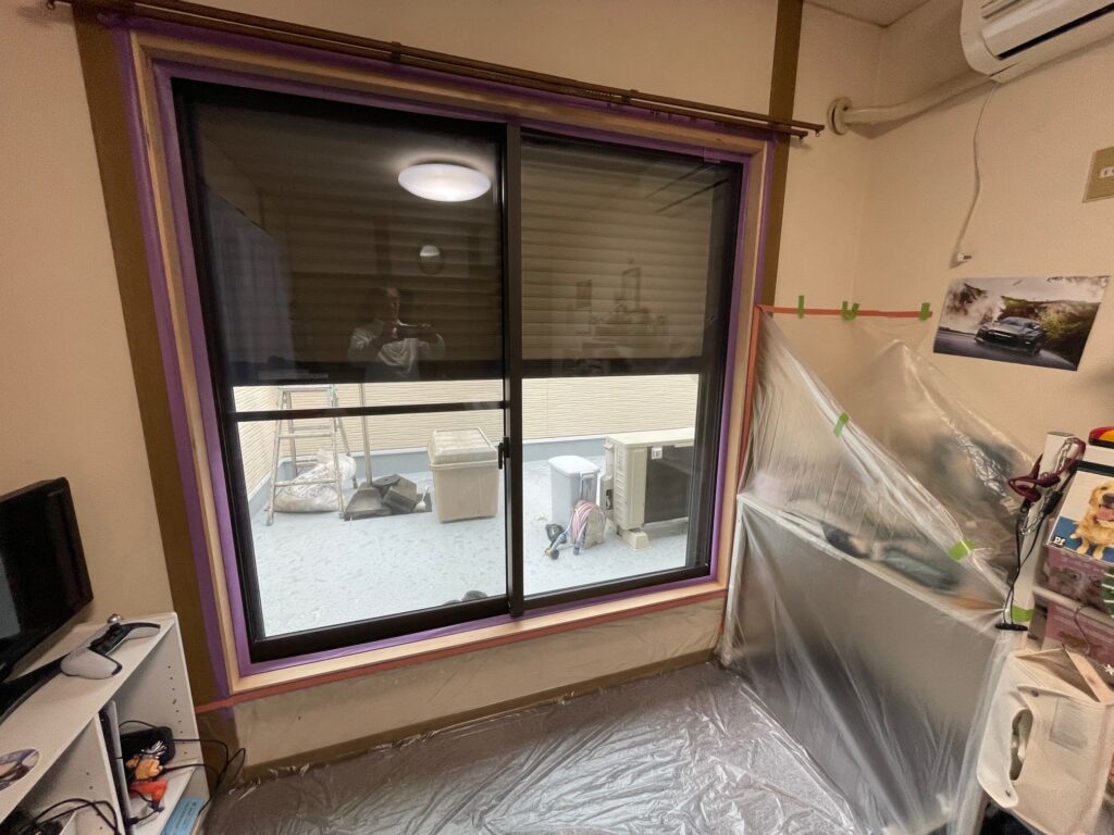 茅ヶ崎市のI様邸で、内部サッシ枠の塗装工事が大詰めを迎えています。